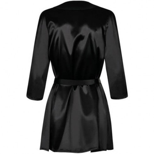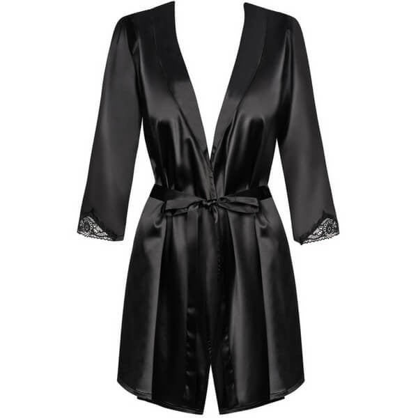 Der tiefschwarze Morgenmantel "Satinia" von Obsessive überzeugt durch sein weiches, bequemes und glänzendes Material. Die breiten dreiviertelärmel Ärmel sind mit einem schönem Stickerei-Einsatz verziert und bringen einen verspielten Touch rein. Der Morgenmantel lässt sich innen mit zwei dünnen Satin-Bändchen, und aussen mit einem breiten Satingürtel zuschnüren.