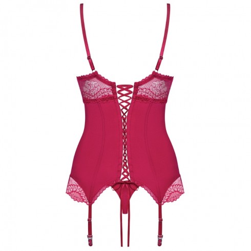 Korsett aus dehnbarem, leicht glänzendem Stoff in Magenta. Die Bügel-Cups sind transparent und am Ansatz wattiert. Dazwischen befindet sich ein süsses Schmuckstück. Hinten lässt es sich mithilfe einer klassischen Korsett-Schnürung schliessen. Vervollständigt wird der Look mit den 4 Strumpfhaltern und einem passenden Minislip.